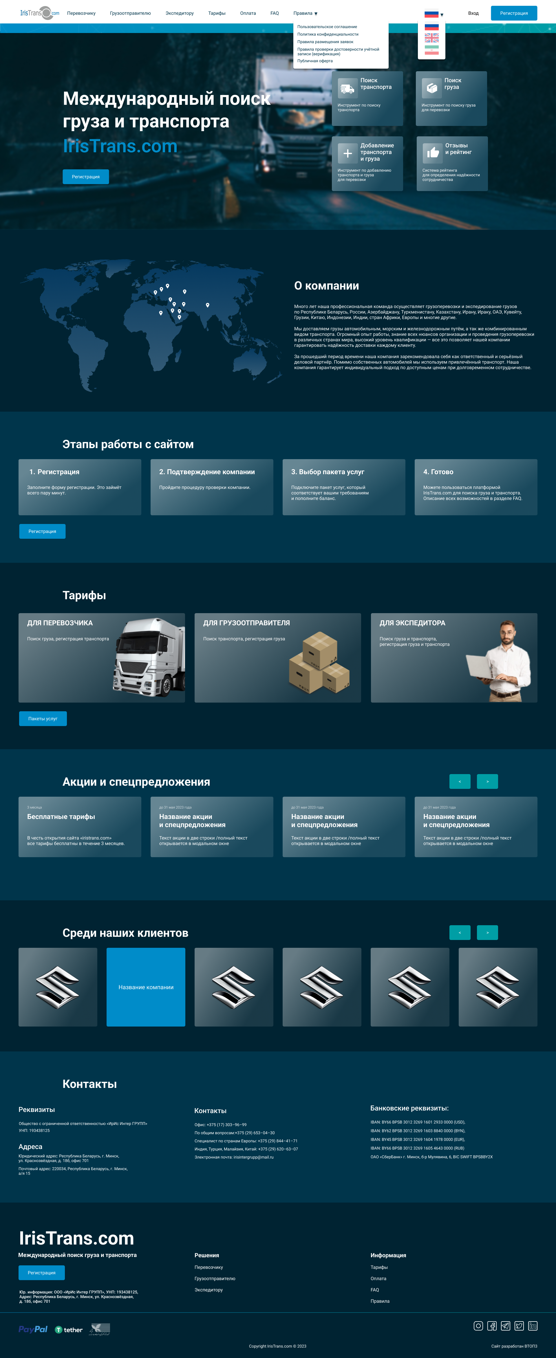 Разработка сайта с уникальным дизайном для компании международного поиска груза и транспорта IrisTrans.com.